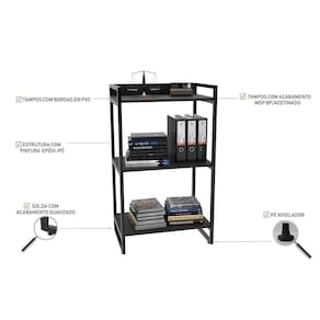 Características do Produto Material da Estrutura: MDP BP 15 mm/Aço. Peso Suportado: 5 Kg por prateleira/ 30 Kg na mesa. Tonalidade: Preto Onix. Acabamento: BP Acetinado e Pintura Epóxi. Escala de Brilho: Fosco. Possui Prateleiras: Sim. Material das Prateleiras: MDP. Possui Pés: Sim, Aço com pintura epóxi. Possui Rodízios: Não. Diferenciais: - Design moderno. - Fita de borda em PVC. - Pés niveladores. - Estrutura reforçada. Sistema de Montagem: Minifix / Cavilhas / Parafs. Manual de Montagem: Sim. Complexidade da Montagem: Baixa. Conteúdo da Embalagem: 1 Estante/1 Mesa. Volumes: 2 Volumes. Garantia do Fabricante: 3 meses contra defeito de fabricação. Montagem: Recomendamos que seja feita por um profissional. Recomendação de Limpeza: Utilize pano levemente úmido.