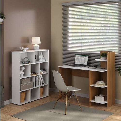 1x Escrivaninha com Estante 3 Prateleiras 111,5cm Link Carvalho/Branco Largura: 111,5 cm Altura: 110 cm Peso: 28,2 kg Profundidade: 51,5 cm Necessita Montagem: Sim