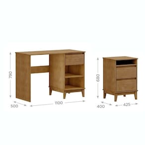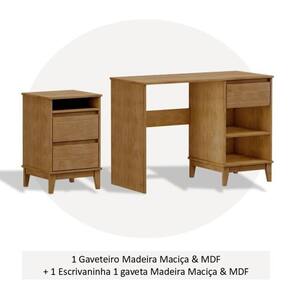O Combo Linha Prata da Finestra, formado pela Escrivaninha 1 Gaveta e pela Mesa de Cabeceira 2 Gavetas, é perfeito para escritório ou home office, unindo funcionalidade e estilo. Produzidos em madeira maciça e MDF com acabamento em verniz acetinado PU/UV, garantem durabilidade e sofisticação. A escrivaninha oferece gaveta prática para organização de materiais de trabalho ou estudo, enquanto a mesa de cabeceira proporciona armazenamento extra e praticidade. Ideal para quem busca móveis modernos, versáteis e com design refinado, combinando conforto e charme no ambiente de trabalho em casa. Suporta Até (kg): 30 kg Acabamento: Pintura UV Altura do Conjunto: 79 cm Ambiente: null Ambiente Principal: Escritório Cor: Freijó Informação Complementar: 1x Mesa de Cabeceira 2 Gavetas 1 Nicho MDF e Madeira Maciça Linha Prata Freijó Largura: 42,5 cm Altura: 68,0 cm Peso: 16,2 kg Profundidade: 40,0 cm Necessita Montagem: Sim
