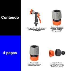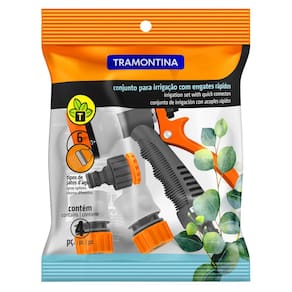 Com o conjunto para irrigação Tramontina com engates rápidos e hidropistola 4 peças, cuidar das suas flores e plantas ficou muito mais prático e agradável! Com peças produzidas em plástico, ele conta com engates rápidos e hidropistola com cabo anatômico e seis tipos de jatos d'água, que servem para ser utilizados desde as flores mais delicadas até arbustos de grande porte.