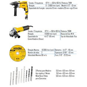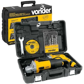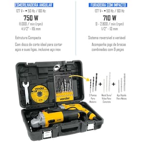 Jogo composto pela esmerilhadeira EAV 754 e pela furadeira FIV 710. Acompanha jogo de brocas combinadas com 9 peças e disco de corte. A esmerilhadeira possui punho auxiliar com duas posições de fixação que atua como apoio durante o manuseio da ferramenta, adaptando-se a diferentes situações e locais de uso, muitas vezes de difícil acesso. Com estrutura compacta, conta com botão de trava do eixo e dupla isolação, garantindo maior segurança ao operador. Já a furadeira possui interruptor eletrônico com pré-seleção de velocidade, que permite controlar a rotação da máquina, possibilitando iniciar um furo com uma rotação baixa e aumentar gradativamente de acordo com a necessidade de perfuração. Conta também com sistema reversível, que facilita a retirada da broca caso ela trave durante a perfuração, botão trava do interruptor para trabalhos contínuos, punho auxiliar e limitador de profundidade, conferindo maior praticidade ao operador. Possui ainda motor com dupla isolação, que garante maior segurança.