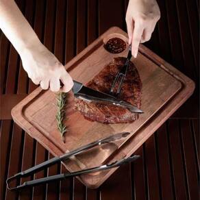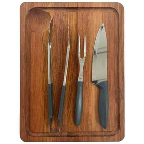 Utensílios de precisão: A faca de 29 cm, o garfo de 26 cm e o pegador de 30 cm, todos em aço inox, garantem cortes precisos, firmeza e segurança no manuseio das carnes.