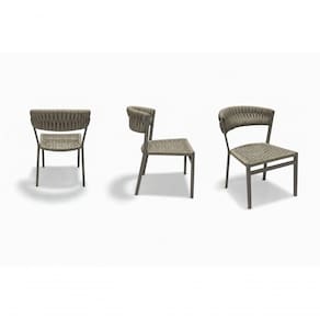 As 10 cadeiras que acompanham o conjunto foram cuidadosamente projetadas para unir conforto e elegância. Fabricadas em alumínio, são leves, resistentes à corrosão e ideais para áreas externas. O assento e o encosto recebem trico náutico, um material nobre, extremamente confortável, de fácil manutenção e próprio para uso ao ar livre, além de agregar um visual contemporâneo e sofisticado ao conjunto.
