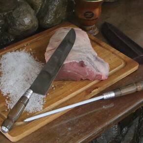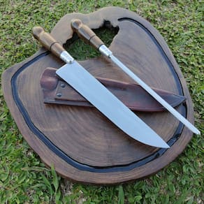 Firmeza e Precisão. Durabilidade e Praticidade. #Cabo de Madeira de Lei #Aço Inox 420 #Faca Larga Garantia: 90 Dias / Peso: 455g / Ref: 4010MT Dimensões da Bainha: 23cm (C) x 7,5cm (L) x 1cm (A) Dimensões da Faca: 37cm (C) x 2,5cm (L) x 4,5cm (A) Dimensões da Chaira: 28,5cm (C) x 2,5cm (L) x 2,5cm (A) Medidas da lâmina: 25cm x 1mm (espessura) x 4,5cm (A) Lâmina: Polida, Partial Tang. Material: - Couro; - Madeira de Lei; - Aço Inox 420: Material de excelente resistência a oxidação, com tempera, possuindo grande dureza e mantendo o fio por muito tempo. Faca Gaúcha Picanheira, feita com aço inox 420, material que possui excelente corte e ótima retenção de fio. Acompanha chaira estriada endurecida por tratamento térmico indutivo, e revestida em cromo duro, proporcionando o uso prolongado. O ranhuramento da chaira é uniforme e contínuo isento de falhas, proporcionando afiação com facilidade. Cabos produzidos com madeira nobre e bainha de couro, é um conjunto campeiro de qualidade.