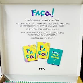 Conjunto Faça História 1 Ano Ed. 2019 - Editora FTD A solução educacional Faça foi criada a partir dos princípios da cultura maker, um movimento contemporâneo com o propósito do fazer artesanal. Apoiando-se em documentos oficiais, como a Base Nacional Comum Curricular BNCC , a solução educacional Faça se preocupa em indicar momentos de aplicação das metodologias ativas, uma vez que o aluno é o sujeito central da ação educacional. O professor se torna um facilitador, que permite à criança aprender com autonomia e interação. - Condição: Novo Nunca - Capa: Mole - ISBN: 789-86-834-3592-8 - Autor: Vários autores - Editora: FTD - Páginas: 350 - Publicado em: 2019 - Edição: 1 - Idioma: Portugês - Gênero: História - Formato: 26 x 29 cm largura x comprimento Obs:acompanha dentro da caixa: - 03 Livros em espiral. Marca: Não Informado