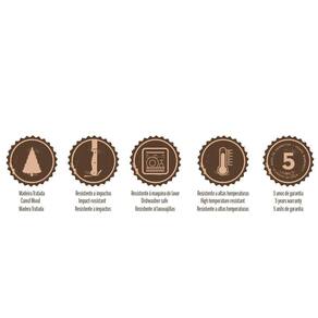 As lâminas de aço inox têm maior durabilidade do fio devido ao tratamento térmico. Os cabos de madeira tratada Polywood são resistentes à impactos e alta temperaturas garantindo maior resistência e durabilidade. Rebites de alumínio. Podem ir à máquina de lavar louças facilitando seu dia a dia.