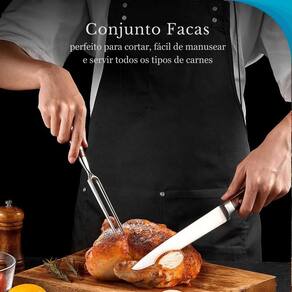 CARACTERÍSTICAS Lâminas de aço inoxidável resistentes à corrosão e de alta durabilidade Cabos de madeira com design rústico, proporcionando firmeza e conforto no manuseio Estojo de transporte prático, ideal para guardar ou levar o kit para onde desejar Versatilidade: perfeito para cortar carnes, legumes, pães e outros alimentos