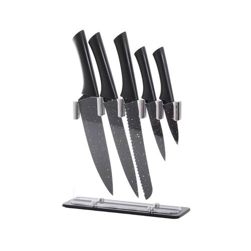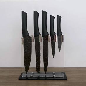 Caracteristicas do Produto: - Composição: Inox, polipropileno e acrílico; - Conteúdo: 1 Suporte e 5 facas; - Cor: Preto.