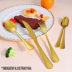 O aço inox, material utilizado na fabricação dos garfos e facas, confere resistência à corrosão e permite o uso frequente. Essa característica torna o conjunto adequado tanto para o dia a dia quanto para eventos especiais, complementando a composição da mesa posta. A cor dourada adiciona um toque de requinte, adaptando-se a diferentes paletas de cores e estilos de decoração.