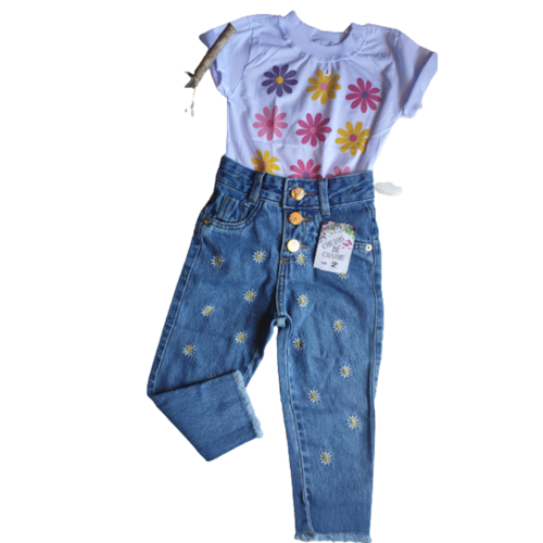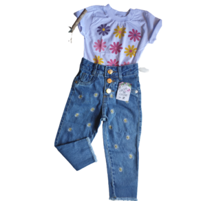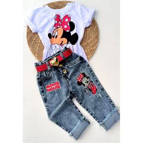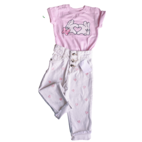 Blusa T-shirt com estampa na parte frontal, calça jeans com bordado na parte frontal, elástico cintura ajustável, fechamento em botão e ziper.