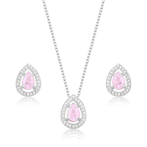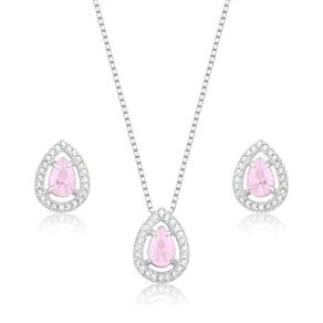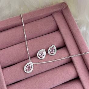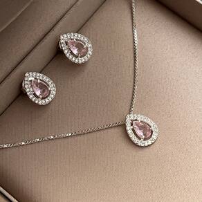 Este conjunto é composto por um colar e um par de brincos, ambos exibindo um design harmonioso e sofisticado. O pingente e os brincos possuem o mesmo formato de gota, cada um adornado com uma pedra central rosa claro, cuidadosamente lapidada, que é envolvida por uma moldura cravejada de pequenas pedras brilhantes, criando um efeito cintilante.