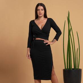 CONJUNTO CROPPED ENVELOPE E SAIA MIDI Somos fabricantes e garantimos a qualidade do nosso tecido e da nossa costura em todos os detalhes. Todas as peças são revisadas antes de serem enviadas. Tecido: Canelado Premium, que estica muito, se ajustando ao corpo. Ele tem toque de algodão, com ultraconforto, que não desbota, não dá bolinhas e não encolhe. A BLUSA CROPPED envelope tem um design único e super versátil, pois ela pode ser amarrada de várias formas diferentes no corpo. O seu decote em v, pode ficar na frente (alongando a silhueta e valorizando o colo) ou nas costas, se tornando um decote canoa na frente, tornando a peça mais discreta, sem abrir mão da elegância. Além dessas duas formas de amarrar mais básicas, citadas acima, a blusa transpasse pode ser amarrada como top mais curto, dando duas voltas nas tiras, na parte da frente e também com um único laço frontal. Use a criatividade com essa peça chave, para um armário mais inteligente, cheio de opções de looks, em um só modelo de blusa. Comprimento das mangas: Midi – 3/4. Detalhes: Gola em V ou canoa, depende da forma que ela é amarrada no corpo; Mangas ajustadas, que dão equilíbrio a diversas combinações de looks; Barra com tiras de amarrar, reguláveis, possibilitando diversas formas de uso. A SAIA LÁPIS com fenda lateral é uma peça de roupa versátil que combina perfeitamente com diversas ocasiões e estilos. Elaborada com um design contemporâneo, a saia lápis possui uma modelagem mais ajustada, que valoriza as curvas femininas de forma elegante. Comprimento: Midi/alongado (Na altura da metade da panturrilha) dependendo da sua altura. Detalhes: Elástico confortável e seguro na cintura; Fenda lateral; Modelagem reta.