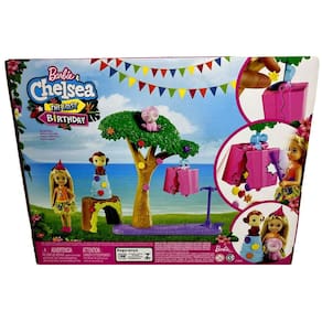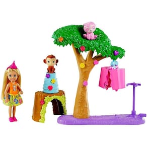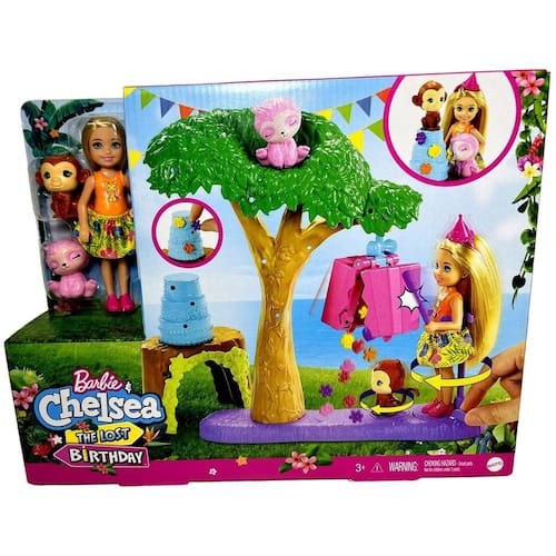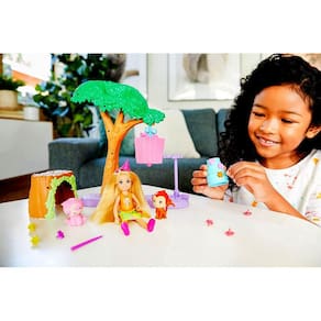 A boneca Chelsea está comemorando seu aniversário com os seus amigos animais e um grande presente repleto de surpresas divertidas. As crianças podem prender a boneca Chelsea e seu amigo macaco no conjunto e, em seguida, girá-los para ajudar a boneca Chelsea a balançar no presente surpresa. Quando ele abrir, surgira um arco-íris de acessórios plug-and-play prontos para brincar! Use-os para decorar a árvore e o bolo da boneca Chelsea e festejar com o bebê preguiça e o amigo macaco. Seus amigos animais podem ser conectados ao conjunto, permitindo um mundo de brincadeiras ativas e narrativas inspiradoras!
