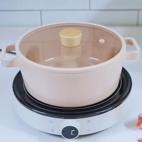 Conjunto de panelas e fogão de indução. Panelas em alumínio forjado com revestimento cerâmico. Tampas de vidro temperado. Fogão com design moderno e eficiência energética.Luz de calor residual