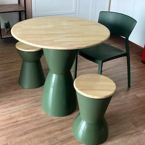 Material: Polipropileno (plástico de engenharia reciclável) + pinus (apenas o tampo da mesa)