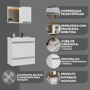 -Gabinete com 2 portas e 1 gavetão: puxadores de alumínio tipo perfil e corrediças telescópicas-Espelheira com 1 porta com divisória e puxador de alumínio e espelho-Cuba em cerâmica já com furação para torneira.