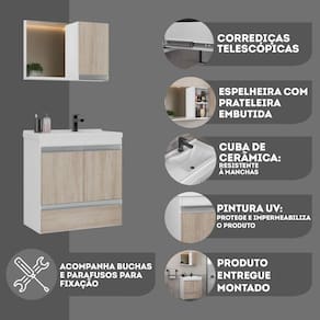 -Gabinete com 2 portas e 1 gavetão: puxadores de alumínio tipo perfil e corrediças telescópicas-Espelheira com 1 porta com divisória e puxador de alumínio e espelho-Cuba em cerâmica já com furação para torneira.