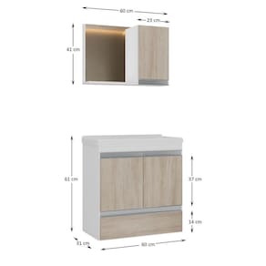 Medidas gabinete: 60cm x 31cm x 61cm (larg. x prof. x alt.)Medidas espelheira: 60cm x 41cm x 13cm (larg. x alt. x comp.)Medidas pia inteira: 60cm x 31cm (larg. x prof.)