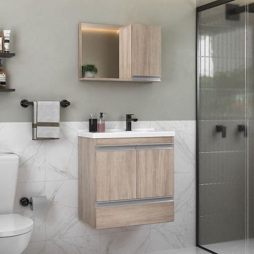 Medidas gabinete: 60cm x 31cm x 61cm (larg. x prof. x alt.)Medidas espelheira: 60cm x 41cm x 13cm (larg. x alt. x comp.)Medidas pia inteira: 60cm x 31cm (larg. x prof.)