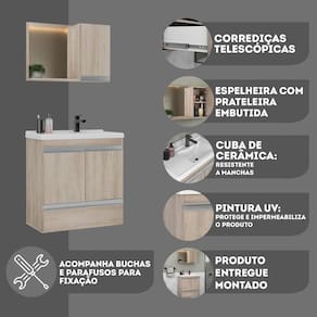 -Gabinete com 2 portas e 1 gavetão: puxadores de alumínio tipo perfil e corrediças telescópicas-Espelheira com 1 porta com divisória e puxador de alumínio e espelho-Cuba em cerâmica já com furação para torneira.