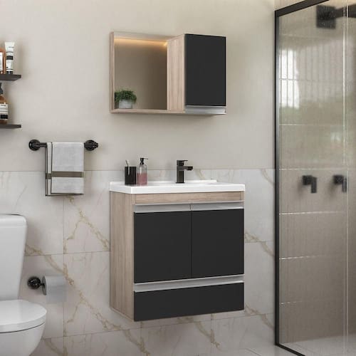 Gabinete + Cuba + Espelheira(modelo moderno com puxadores perfil, amplo espaço interno e estreito para banheiro menores)