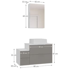 Medidas gabinete: 80cm x 40cm x 47 (comp. / prof. / altura)Medidas da pia sobrepor : 34x34x11Medidas Espelheira : 60cm x 40cm x 14cm (comp. / altura / prof)