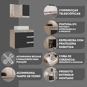 Acompanha : Gabinete + Cuba Elevada + Espelheira com espelho + Tampo Vidro Temperado