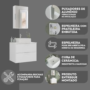 Modelo moderno, com puxador de alumínio.Medidas gabinete: 60cm x 40cm x 47 (comp. / prof. / altura)Medidas da pia sobrepor : 34x34x11Medidas Espelheira : 60cm x 40cm x 14cm (comp. / altura / prof)