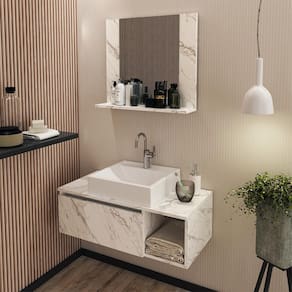 O Kit para Banheiro é a escolha ideal para transformar o seu espaço em um ambiente elegante e organizado. Com um design atual, ele oferece não apenas beleza, mas também funcionalidade, contribuindo para um banheiro agradável e útil. Produzido com materiais de alta qualidade, o kit garante durabilidade e resistência, criando um ambiente harmonioso e agradável para o seu dia a dia. CARACTERÍSTICAS TÉCNICAS: - Produzida em MDP de 15 mm - Acabamento UV na cor Mármore Branco - Acompanha Espelho - Cuba em Mármore Sintético - Porta Basculante com Dobradiça e Articulador - Balcão Suspenso - Puxador tipo Cava *Kit Composto por Gabinete Suspenso (3601), Espelheira (3610) e Cuba (3630) INFORMAÇÕES TÉCNICAS: 3601: Alt. 26,5 x Larg. 80 x Prof. 38,7 cm P. 10,8 kg 3610: Alt. 54 cm x Larg. 60 cm x Prof. 15,6 cm x P. 6,35 3630: Alt. 11,5 x Larg. 35 x Prof. 34 cm P. 5,5 kg INFORMAÇÕES ADICIONAIS: - ATENÇÃO: Não trabalhamos e não nos responsabilizamos pela montagem do móvel. Antes da montagem conferir se o produto está de acordo com o que comprou, produto montado e danificado pela montagem não será aceito troca. Montagem e instalação por conta do comprador. - As imagens ambientadas são meramente ilustrativas e podem apresentar itens que não compõe o produto. As cores do produto podem variar de acordo com o monitor, a iluminação do ambiente ou sua percepção visual. - Limpeza: Deve ser feita com pano macio e seco ou levemente. Não devem ser utilizados abrasivos como palha de aço e objetos cortantes. Garantia para defeitos de fabricação conforme Código de Defesa do Consumidor.