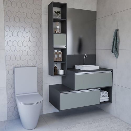Conjunto Gabinete E Espelheira Plena Conceito 100cm Chumbo Verde Conjunto Gabinete e Espelheira Plena Conceito 100cm Chumbo Verde - Redefina o conceito de elegância no seu banheiro com o Plena Conceito 100. Este conjunto premium de sobrepor combina design moderno com qualidade excepcional. O balcão (70cm alt x 100cm larg x 45cm prof) é robusto e funcional, enquanto a espelheira (110cm alt x 100cm larg x 20cm prof) adiciona um toque de luxo e amplitude. Para quem exige o melhor em cada detalhe.