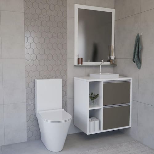 Conjunto Gabinete E Espelhiera Plena Compact 60cm Bronze Conjunto Gabinete e Espelhiera Plena Compact 60cm Bronze - Sofisticação também cabe em espaços menores! O Plena Compact 60 traz toda a qualidade premium da linha Plena em um formato mais compacto. O conjunto de sobrepor inclui um balcão elegante (70cm alt x 60cm larg x 45cm prof) e uma espelheira charmosa (90cm alt x 60cm larg, profundidade N/A). Ideal para quem não abre mão do luxo e da qualidade, mesmo com menos espaço.
