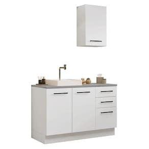A composição inclui um balcão com três gavetas e duas portas, além de um armário aéreo com uma porta, ideal para manter o ambiente sempre organizado, com espaço para produtos de higiene, toalhas ou itens decorativos.
