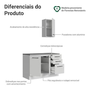 O acabamento branco traz luminosidade e leveza ao ambiente, enquanto os puxadores em alumínio no tom preto adicionam elegância, garantindo longa durabilidade. Os pés reguláveis proporcionam estabilidade, e o rodapé removível facilita a limpeza, tornando o uso ainda mais prático no dia a dia.