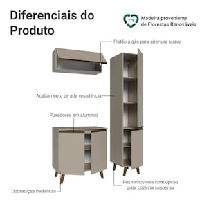 Produzido com materiais de qualidade, possui dobradiças metálicas nas portas e puxadores em perfil de alumínio, garantindo resistência. A porta basculante possui pistão, que a mantém suspensa enquanto está aberta, oferecendo mais conforto e segurança no uso e o acabamento é de alta resistência, garantindo durabilidade.