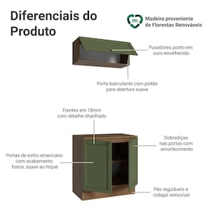 Com estrutura no tom amadeirado Rustic e frentes em Verde, o acabamento é de alta resistência e possui textura suave ao toque, garantindo durabilidade por muito mais tempo. O destaque fica por conta dos puxadores ponto em ouro envelhecido, feitos em metal resistente, que adicionam personalidade e um charme único. O detalhe chanfrado das frentes forma molduras elegantes, inspiradas no estilo americano com um toque moderno.