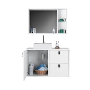 Composto por Espelheira com armário com porta e prateleira interna e espelho, Gabinete com porta e cuba inclusa.