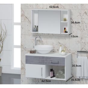 PRODUTO TOTALMENTE RESISTENTE A ÚMIDADE E RESPINGOS DE ÁGUA! Acabamento da Cuba: Alto Brilho Acabamento da Gaveta: Pintura UV Acabamento da Porta: Pintura UV Acompanha Cuba: Sim Acompanha Tampo: Sim Ambiente Principal: Banheiro Cor: Rovere Cor da Cuba: Branco Cor do Produto: Rovere Cor Interna: Branco Escala de Brilho: Brilhante Escala de Brilho da Gaveta: Brilhante Escala de Brilho da Porta: Brilhante Espessura do Espelho: 3 mm Formato do Espelho: Retangular Furação para Cuba e Torneira: Sim Gaveta com Chave: Não Itens Inclusos: Gabinete + Cuba + Espelheira Linha ou Coleção: Linha Stilo Manual de Montagem e Instalação: https://cdn2.madeiramadeira.com.br/atributo/contarini/1171219-contarini-moveis.pdf Material da Cuba: Mármore Sintético Material da Gaveta: MDF Material da Porta: MDF Material do Puxador da Gaveta: Plástico Material do Puxador da Porta: Plástico Material do Tampo: MDF Material Principal: MDF Medida da Cuba (C x L x P): 13,5 (alt) x 34 (diam) Medida da Espelheira (A x L x P): 36,4 x 62,6 x 13 Medida do Gabinete (A x L x P): 35,9 x 62,5 x 36,5 Necessita Montagem: Não Origem do Produto: Nacional Peso: 17 kg Peso Máximo por Gaveta: 5 kg Possui Espelheira: Sim Possui Gabinete: Sim Possui Gavetas: 01 Possui iluminação: Não Possui Pés: Suspenso Possui Portas: 01 Possui Rodízio: Não Recomendações de Uso, Manutenção e Limpeza: A limpeza deve ser feita com pano úmido e liso. Não deve ser utilidade materiais ásperos ou jatos de água diretamente sob o produto. Suporta Até (kg): 15 kg Tamanho do Espelho (A x L): 37 x 33,3 Tipo de Corrediça da Gaveta: Metálica Simples Tipo de Dobradiça/Corrediça da Porta: Metálica Tipo de Gabinete: Gabinete Suspenso Tipo de Porta: Bater Tipo de Puxador da Gaveta: Externo Tipo de Puxador da Porta: Externo Marca: Contarini