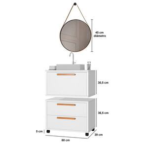 Composto por uma bancada suspensa com tampo de vidro e cuba inclusa, um módulo gaveteiro com duas gavetas e rodízios, um espelho redondo com alça de couro e suporte para pendurar incluso.