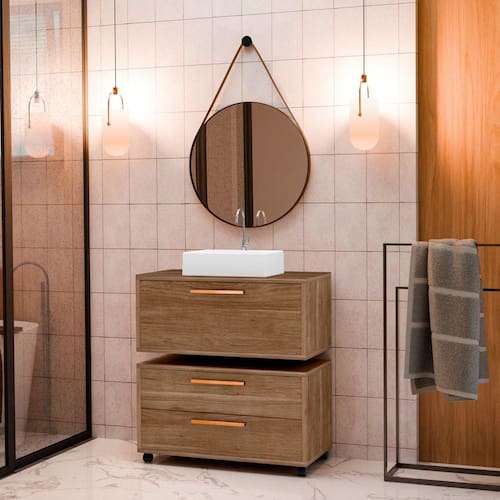 Composto por uma bancada suspensa com cuba inclusa, um módulo gaveteiro com duas gavetas e rodízios, um espelho redondo com alça de couro e suporte para pendurar incluso.