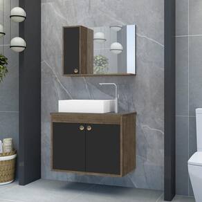 O conjunto é produzido em MDP 12 mm e MDF 15 mm, materiais de alta qualidade com acabamento resistente. Recomenda-se manter boa ventilação no banheiro para maior durabilidade.
