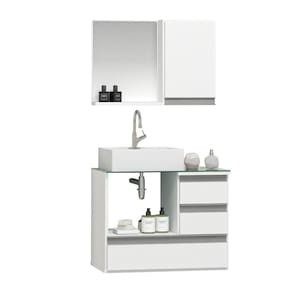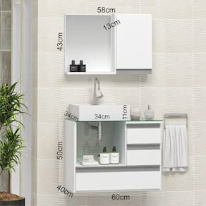 Modelo moderno, com puxador de alumínio tipo perfil. (móveis iguais sob medida)Medidas gabinete: 60cm x 40cm x 50 (comp. / prof. / altura)Medidas da pia sobrepor : 34x34x11Medidas Espelheira : 60cm x 40cm x 14cm (comp. / altura / prof)Medida Tampo Vidro: 60cm x 40cm com 6mm de espessura (vidro temperado)