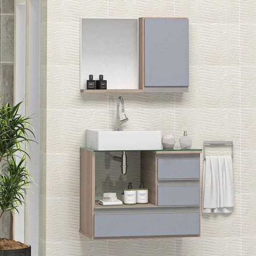 Acompanha : Gabinete + Cuba Elevada + Espelheira com espelho + Tampo Vidro incolor