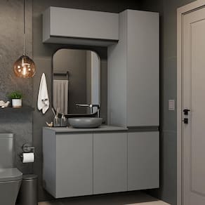 Formado por um balcão com duas portas, um armário com diversas prateleiras internas, e um aéreo com porta basculante. Cada módulo foi pensado para oferecer excelente aproveitamento de espaço, ajudando a manter o banheiro sempre organizado e funcional.