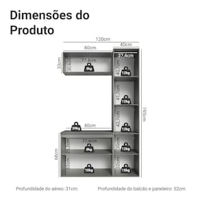 - 31cm de profundidade no aéreo e 52cm no balcão e no armário