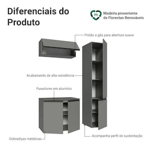 Produzido com materiais de qualidade, possui dobradiças metálicas nas portas e puxadores em perfil de alumínio, garantindo resistência. A porta basculante possui pistão, que a mantém suspensa enquanto está aberta, oferecendo mais conforto e segurança no uso e o acabamento é de alta resistência, garantindo durabilidade.