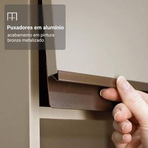 O acabamento é no tom crema, uma tonalidade bege clara que transmite leveza. Com visual moderno, ela combina facilmente com diferentes estilos de decoração, criando um ambiente elegante. Outro diferencial está nos puxadores em bronze metalizado, que acrescenta um toque contemporâneo.