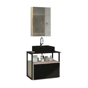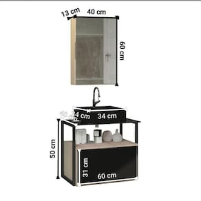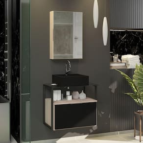 KIT BANHEIRO ESTILO INDUSTRIAL COMPLETO 60cmGABINETE MADEIRA + FERRAGENS PRETAS + CUBA + ESPELHEIRA + TAMPO VIDRO