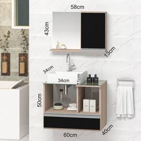Modelo moderno, com puxador de alumínio tipo perfil. (igual móveis sob medida)Medidas gabinete: 60cm x 40cm x 50 (comp. / prof. / altura)Medidas da pia sobrepor : 34x34x11Medidas Espelheira : 60cm x 40cm x 14cm (comp. / altura / prof)Medida Tampo Vidro: 60cm x 40cm com 6mm espessura (vidro temperado)
