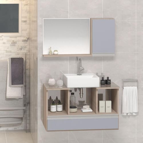 KIT BANHEIRO COMPLETO 80CM -GABINETE + CUBA + ESPELHEIRA + TAMPO VIDRO INCOLOR