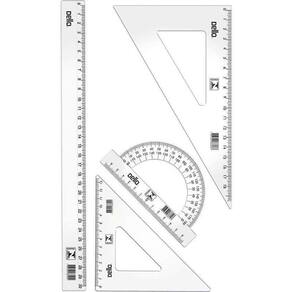 O destaque deste conjunto é a régua de 30cm, que permite traçar linhas retas com facilidade e precisão. Além disso, o conjunto inclui um transferidor de 180º, ideal para medir e traçar ângulos, e dois esquadros, um de 45º e outro de 60º, que são essenciais para criar formas geométricas.